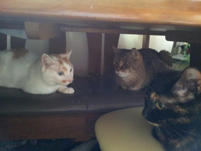 みな可愛いです。"@Fruits_of_Lotus: @TrinityNYC うちのねこたちも全員拾いっ子、昨年おじいちゃんねこを老衰で見送り今はおばあちゃん・女王様・小僧の3猫態勢でお布団警備員です(画像の白茶ブチがおじいちゃん) "